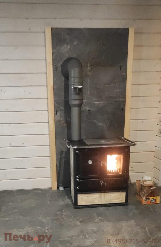 Топка из чугуна, облицовка из керамики, большая варочная поверхность, духовка.