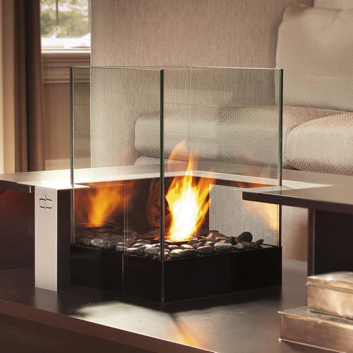 Реже встречаются настольные биокамины с топливным блоком – они выглядят своеобразно, как уменьшенные копии напольных моделей. Обратите внимание на камин Silver Smith Simple Black. Прямоугольные стеклянные стенки дают возможность увидеть в основании миниатюрный топливный блок наподобие тех, что располагаются в более масштабных изделиях. Это интересный камин – почти как большой, но маленький.